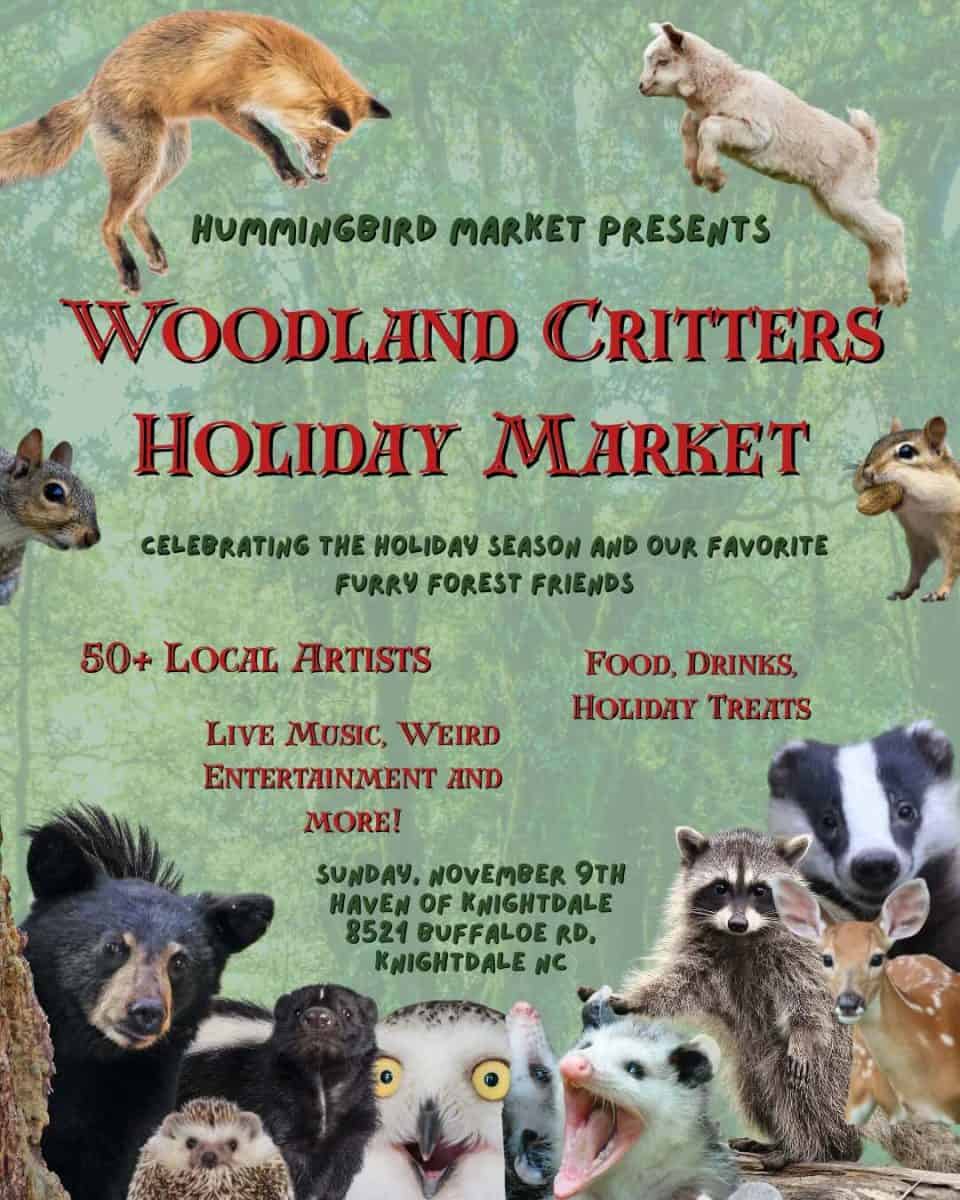 Hummingbird Market is presenting The Woodland Critters Holiday Market on Sunday, November 9, 2025, from 10:30 a.m. to 3 p.m., at Haven of Knightdale, 8521 Buffaloe Road, Knightdale, North Carolina.