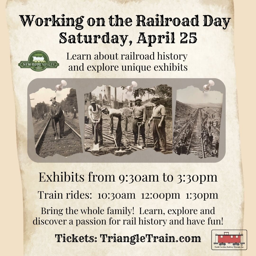 New Hope Valley Railway, 3900 Bonsal Road, New Hill North Carolina, is bringing back a favorite event from years past: Working on the Railroad Day. It takes place on Saturday, April 25, 2026, from 9:30 a.m. to 3:30 p.m.