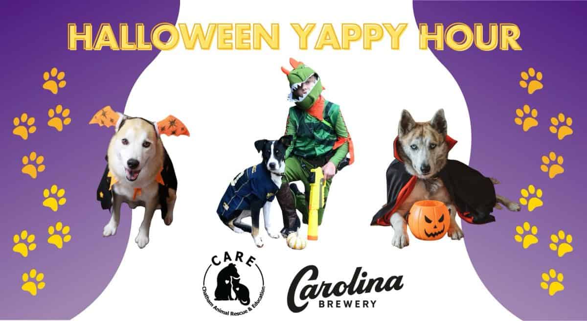 Chatham Animal Rescue & Education is presenting a Halloween Yappy Hour on Monday, October 20, 2025, from 5 to 7 p.m., at The Carolina Brewery and Grill, 120 Lowes Drive, Pittsboro, North Carolina.