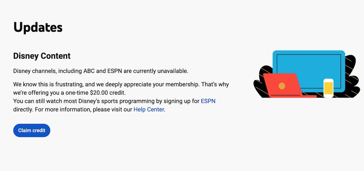 At least, though, there’s a little compensation. If you’re a YouTube TV subscriber you should have received (or will receive) an email saying that you can get a $20 credit on your account.